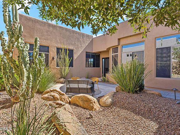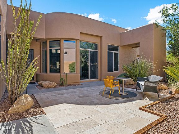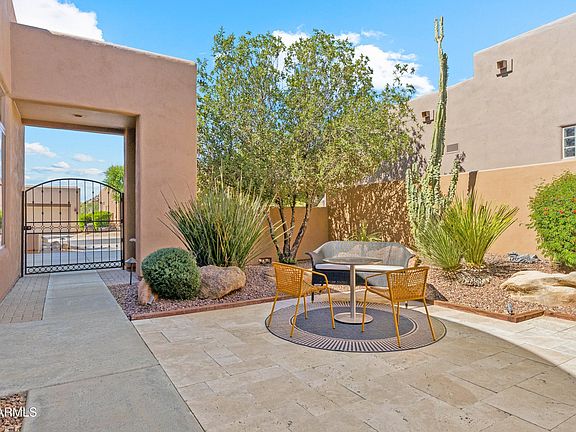 Experience this fully FURNISHED, elegant Desert Retreat in the gated Pinnacle Canyon at Troon North! The split floor plan features an OPEN layout w/12ft ceilings, Spacious Living & Dining with cozy GAS fireplace, Eat-in Kitchen with large Island, Premium KitchenAid Stainless-Steel Appliances, abundant Cabinetry & Counter space. Expansive sliders open to SERENE courtyard ideal for Relaxing or Entertaining. The primary suite offers Courtyard Access, custom Walk-in Closet, dual sinks, Soaking Tub, & Walk-in Shower, Secondary Guest Room is ideal for office or guest space, Garage Epoxy, Water Softener & So Much More. Enjoy a peaceful, PRIVATE backyard/courtyard w/Unobstructed Desert & Mountain Views - close to golfing, dining, hiking, tennis & pickleball. A truly Beautiful Home to Enjoy!
