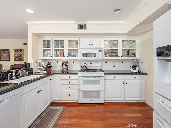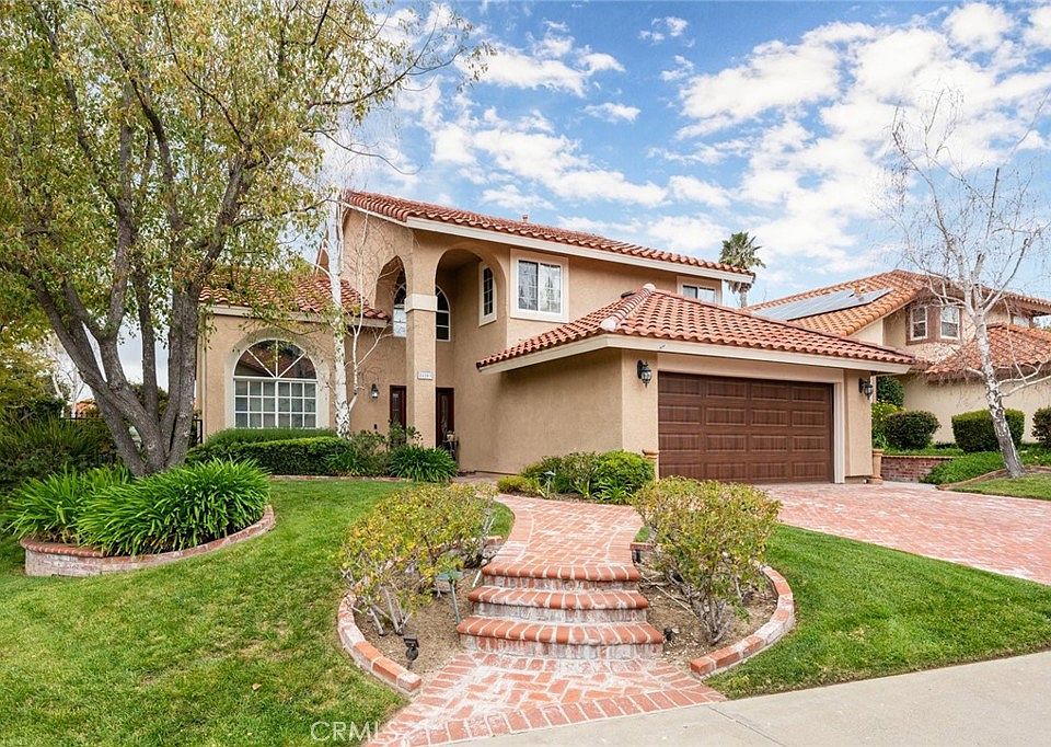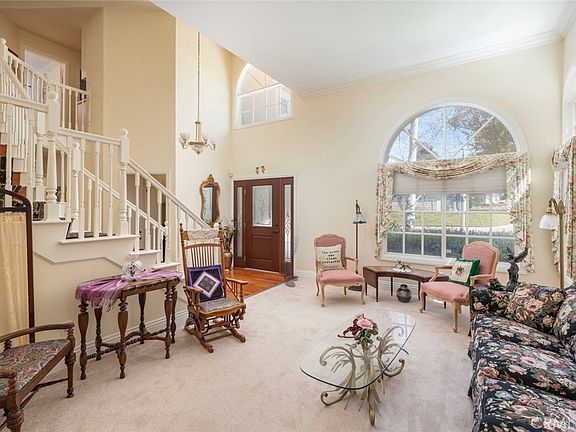 Charming 4 bedroom 3 bath home. The downstairs bedroom has been converted into a beautiful library/office with custom cabinetry. Upstairs features 3 bedrooms, a private bathroom for the primary bedroom, and a full bath off the hallway. Lovely wood flooring. throughout most of the home. Livingroom with formal a formal dining area. Kitchen is light and bright with a kitchen nook. The family room offers a cozy room with a fireplace and looks out into the lush beautiful yard and patio. The brick patio and built in BBQ is sure to give outdoor pleasure year round. Be sure to peek into the 2 ca garage where you'll find an amazing amount of storage cabinets. No Mello Roos. No HOA. This home is truly charming.