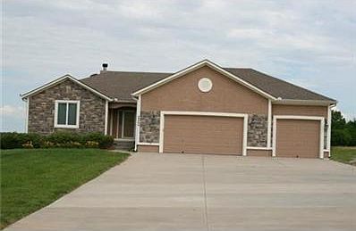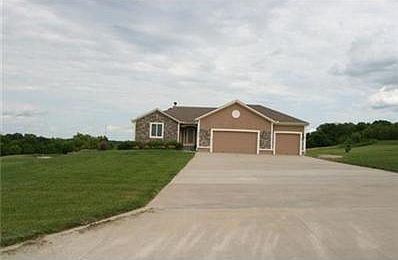 Country Comfort ~ Close to City (30 minutes to Overland Park). Sought after ranch on 5 gorgeous acres & your own pond. 4 bedrooms, 3 baths, Open floor plan, Eat-in Kitchen, laundry/mudroom connects the oversized 3-car attached garage, perfect for the boat lover.. Formal Great room with fireplace & hardwoods. Finished walkout basement with 4th bedroom and Kitchenette. Single Paved Cu-de-sac 5 minutes to Hillsdale Lake. Move-in ready.