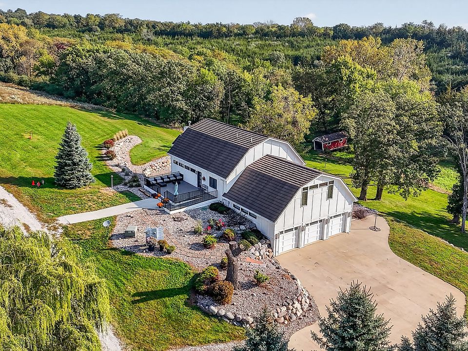 Discover a rare opportunity to own a beautiful executive acreage nestled in the rolling hills of Guthrie County, just on the outer edge of Lake Panorama and only an hour from the Des Moines Metro. This stunning 3,592 SF zero-entry home offers 2 bedrooms, 2 bathrooms, an additional flexible room (ideal as a 3rd bedroom or office), and a spacious multi-purpose loft perfect for an extra bedroom, workspace, or storage. The heart of the home features an updated kitchen with new appliances, cozy in-floor heat, and a stone electric fireplace. The expansive family room boasts wraparound windows that flood the space with natural light and a charming wood-burning fireplace. Step outside to enjoy a new deck, stone patio, covered stamped-concrete porch, and breathtaking Iowa sunsets. A 3-stall oversized heated garage with high ceilings adds functionality and storage. The home runs on an efficient all-electric geothermal system and is connected to rural water. Set on pavement with mature trees, meticulous landscaping, a perimeter fence, and even a picturesque covered bridge, this property is both peaceful and practical. Additional land and buildings are available. Whether you're seeking privacy, room to grow, or a lifestyle retreat, this executive acreage is a true gem in a highly desirable area.
