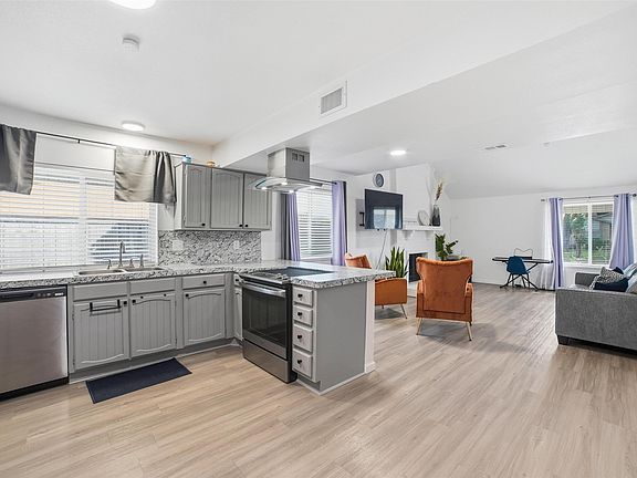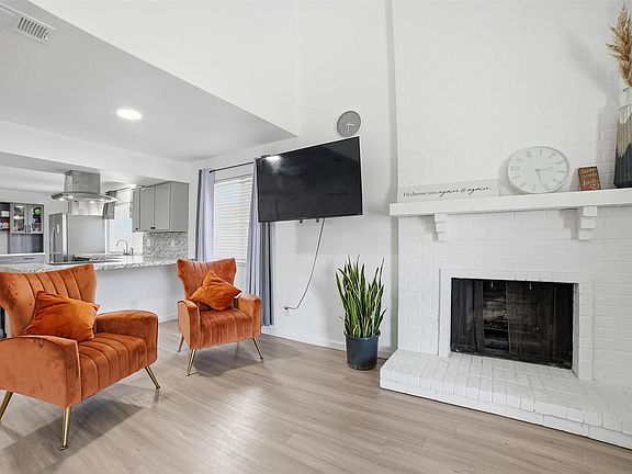 Brick fireplaceOpen floorplanUpdated counter topsWood laminate floorsFormal dining tableSoaring vaulted ceilingLarge yard