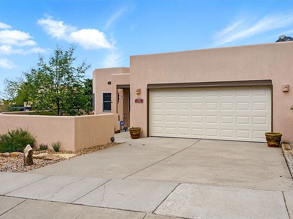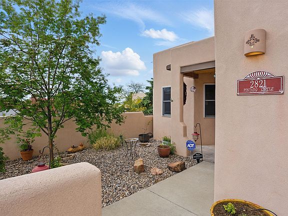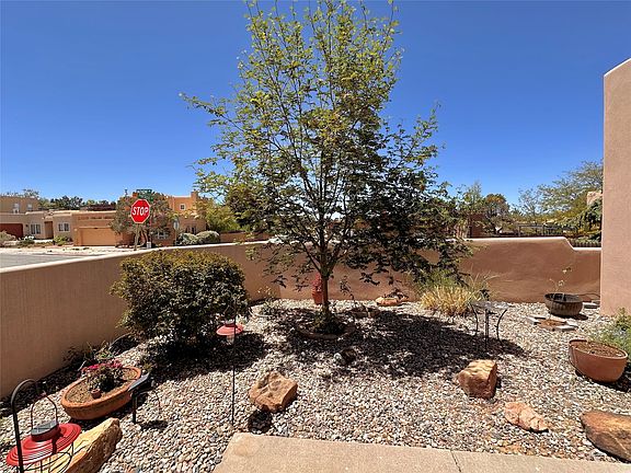 Located in the sought-after Pueblos del Sol community, this light-filled, artfully designed home features high ceilings, radiant heat, granite kitchen countertops, and deep soaking jet tubs in both bathrooms. A vibrant red Art Deco front door welcomes you into a warm, character-rich interior with freshly painted primary spaces and elegant mahogany and tigerwood floors. Set on a corner lot, the home offers a resplendent front courtyard and a backyard oasis reminiscent of a bird sanctuary—lush with mature trees, vibrant blooms, and a low-maintenance drip irrigation system. Enjoy al fresco dining under a cantilever umbrella, stone water fountain, grill with ease, and unwind by the fire pit while watching stunning Santa Fe sunsets. The community features extensive walking trails, a newly constructed playground, and convenient access to shopping, dining, and healthcare. This private retreat perfectly blends comfort, charm, and natural beauty. Foliage includes: cardinal red mountain ash, fruiting currant and gooseberry bushes, cherry and purple plums, Rowan, blue spruce, Austrian pine, flowering desert willow, Morning Cloud chitalpa, Scotch broom, Russian sage, and roses. Seize this rare opportunity to create your best enchanted life in your own Santa Fe sanctuary.