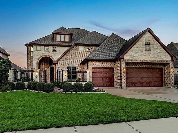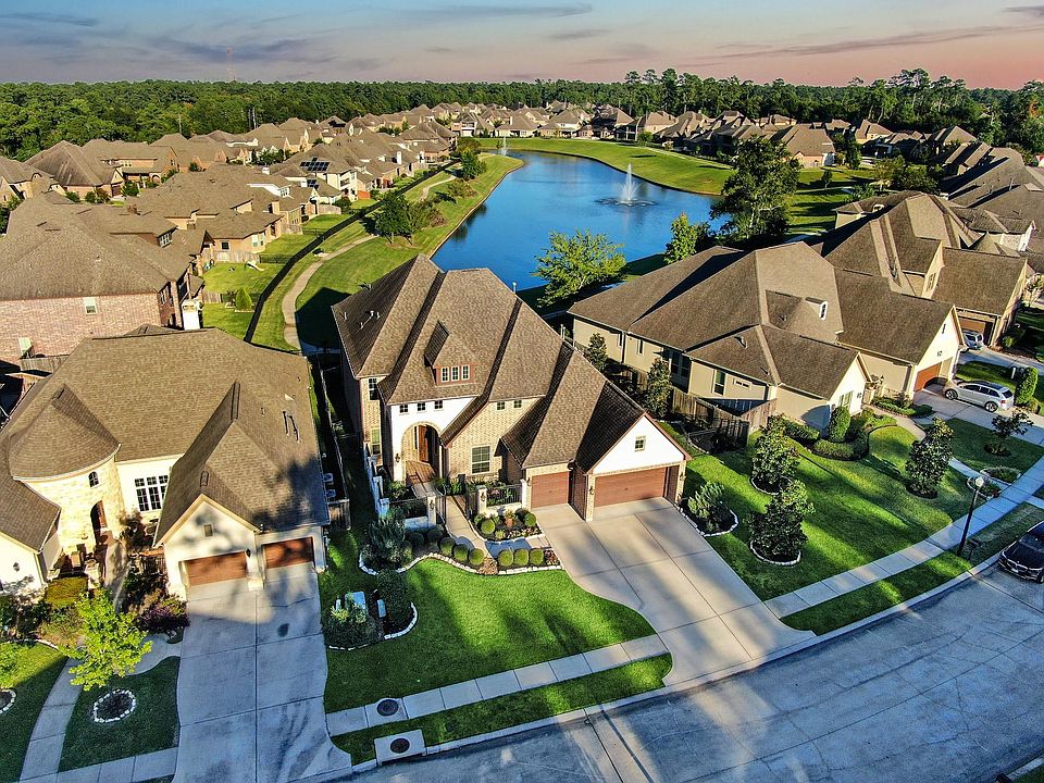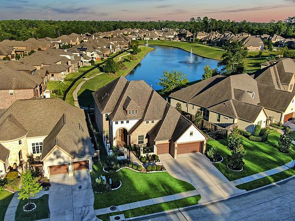 Located in a gated, luxurious resort style community featuring lakeside living, scenic jogging trails & community pool, this 5 bedroom executive waterfront home is ideal! Grand entry with sweeping staircase will welcome guests to this wonderful home complete with gourmet kitchen featuring huge island, double oven, 5 burner gas cooktop with breakfast nook, large pantry, butlers pantry, beautiful custom cabinets & is open to living room with captivating views of private neighborhood lake. Primary bedroom has a magnificent en suite with separate tub & walk in shower, dual vanities & generous closet space. Large study & formal dining and second 1st floor en suite bedroom. Upstairs has 3 bedrooms & two full baths, game room with balcony overlooking lake, & media room. Minutes from the Exxon campus, The Woodlands & easy commute to IAH or town. Truly a resort atmosphere where you can relax, rejuvenate & be inspired!