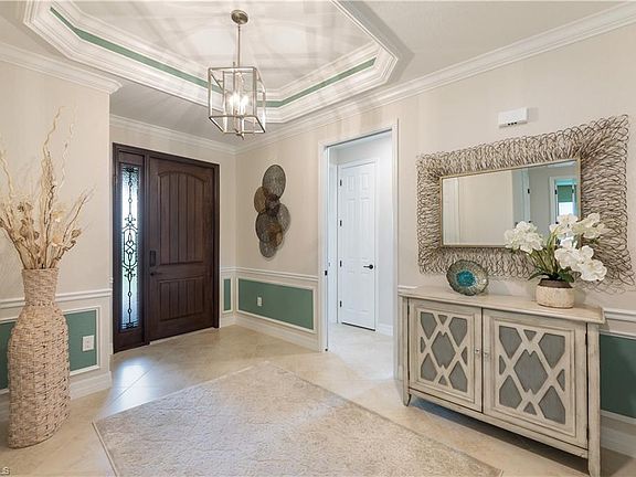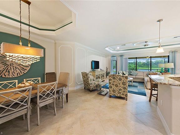 Gorgeous residence with amazing lake views. This four bedroom two bath home is being offered turnkey furnished with minor exclusions (garage items only). Exquisitely decorated in soft tones with turquoise accents this home shows like a model. Designer ceiling treatments great you in the grand foyer into the open concept living, dining and kitchen area all featuring the pool area and lake view. This home offers large tile on the diagonal, crown molding, coffered ceilings and designer wall treatments. The spacious kitchen is light and bright and is open to the living room for ultimate entertaining. This residence boasts a brick paved lanai with pool and waterfall spa and summer kitchen. Fiddler's Creek has amazing amenities including tennis, restaurants, fitness center, pool, spa and golf with an additional golfing membership.