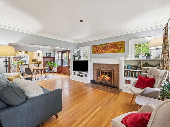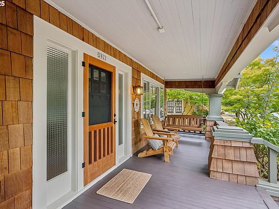 Charming Alameda bungalow with a front porch that dreams are made of and gorgeous stained cedar shake siding. The living room has a wood fireplace and gorgeous wood floors that continue through the rest of the main floor. The dining room features stained wood wainscoting and trim. The updated kitchen is a chef's delight with an island, a plethora of storage and high-end Bosch appliances including the gas range. Ann Sacks tile and Schoolhouse Electric lighting in kitchen. Two bedrooms on the main floor with the primary suite upstairs is the perfect layout. The basement features a family room and the fourth (non-conforming) bedroom. Plus lots of storage. The fenced back yard and patio are perfect for summer entertaining. Oversized detached one car garage and private driveway. New roof in 2023. New carpet. Walk Score-84 and Bike Score-88. HES-1 [Home Energy Score = 1. HES Report at https://rpt.greenbuildingregistry.com/hes/OR10240399]