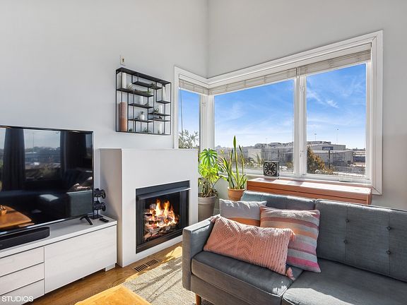 Welcome to penthouse living without the stairs! This spacious 3 bedroom, 2 bathroom corner unit offers top-floor living in an elevator building. Enjoy an open layout with high ceilings and hardwood floors, perfect for entertaining. Cozy up by the fireplace or step out onto one of the three outdoor spaces, including a large private roof deck, for stunning views and outdoor relaxation. Enjoy the convenience of attached garage parking, in-unit laundry, and on-site storage. Don't miss this unique opportunity to call this stylish home yours!