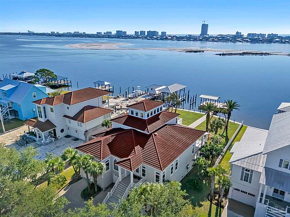 Very rare opportunity on deep, open water with easy access to Perdido Pass and the Gulf of Mexico! Luxury abounds in this one-of-a-kind coastal retreat where no detail has been overlooked. This expansive 4-bedroom, 4-full and 2-half-bath home (potential for 5th bedroom) is set on a beautifully landscaped lot with approx. 90 ft of waterfront on Bayou St. John and features a new deep-water boat dock with slip. Enjoy real wood floors, custom crown molding, and a third-floor observation room offering 360° views of Terry Cove, Johnson Cove, and the Gulf. Impact windows and doors throughout. Spacious bedrooms include a private en-suite and balcony with stunning water views. The elegant wood-paneled elevator accommodates multiple passengers and is handicap accessible. A bonus room with vaulted wood ceiling and arched window enhances the coastal character. The chef’s kitchen boasts imported Brazilian white marble counters, under-counter wine cooler, abundant prep space, and breathtaking water views—ideal for gatherings or entertaining. The 3300 sq ft., 6-car heated and cooled garage offers epoxy floors, half bath, extensive storage, space for rod room, boats, and in-home gym. Step outside to enjoy waterfront activities, outdoor shower, and reinforced bulkhead. The first-floor primary suite features a Bain Swedish spa tub, multi-head shower with exceptional water pressures. Additional highlights include a formal dining room (or study), custom “Birds of Paradise” wrought iron staircase inspired by the Pontalba Building in New Orleans, central vac system, and dedicated laundry and cleaning closet with utility sink. A true coastal masterpiece built for comfort, elegance, and the ultimate waterfront lifestyle.