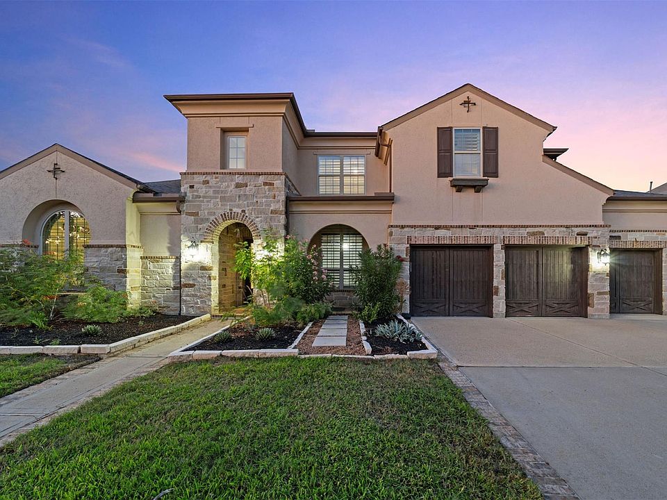 Stunning stucco and stone Highland Home on a 100-ft-wide lot, offering 5 bedrooms — each with a private bath — plus 2 half baths. Features include 2 bedrooms down, a first-floor media room, and a chef’s kitchen with a large island, double butler pantries, and custom cabinetry. The family room impresses with cedar beams and a beautiful fireplace. Wood floors flow through the main areas and staircase. Upstairs offers a game room with wet bar and 3 ensuite bedrooms. Enjoy a covered patio with outdoor fireplace and a 4-car garage with stained cedar doors. Elegant design, functional layout, and high-end finishes throughout.
