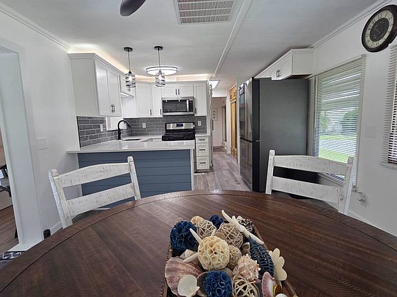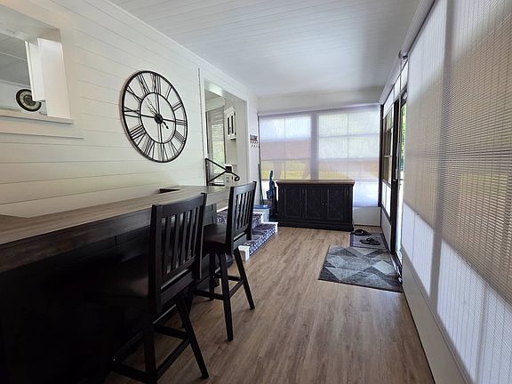 100% PURE PERFECTION- A FLAWLESS, CUSTOM REMODEL! Step into modern luxury with this beautifully updated home featuring a fresh, clean and airy design throughout. The open layout is bright and welcoming and has a thoughtful use of space in every corner. The kitchen is a showstopper complete with upgraded soft close cabinets that offers ample storage while keeping everything neatly tucked away, quartz countertops, glass subway tile backsplash and recently installed rustic beachy ceramic woodgrain tile. The bathroom offers a step-in shower with a ceramic tile surround and an on-demand hot water heater, ensuring warm, comfortable showers anytime. The owner's bedroom comfortably fits a queen bed and features beautiful shiplap accent walls for a cozy stylish retreat. One of the highlights of the home is the 380 sq. ft. Florida Room, expanding your living space and housing both the living room and laundry area. From there, step into the screened room to enjoy peaceful, wooded views. This home is ideally located on the outer circle in the desirable West 3 side of the community, offering tranquility and nature right at your doorstep. A dedicated office area adds versatility and can easily be used as a guest room when needed. Golf Cart is coming with the home for added convenience. Enjoy riding in style to all the amenities and activities the community has to offer. Community sits on Helena Run which provides access to Lake Harris and the Chain of Lakes. Fish the day away or travel the chain stopping off for shopping and an array of restaurants within the Tri-City area of Eustis, Tavares and Mount Dora. Holiday Rv Village is within a hours drive to Disney, many local springs and a short drive to local beaches. This home is a rare find and is a MUST SEE to fully appreciate the craftsman ship. Call today to set up your personal tour you will not be disappointed.