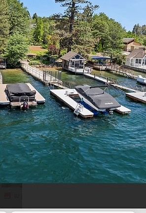A Priceless Opportunity awaits in this Legacy Tavern Bay Lakefront Estate, Featuring the one and only Single Level residence on the Lake. This impeccably maintained and refurbished 1930's Vintage Lakefront estate is in one of Lake Arrowhead's most coveted neighborhoods at Tavern Bay on the North Shore. Iconically known for it's hand crafted Lost Course shingled roof, it's wrought iron gated circular approach, and it's fully self contained two bedroom converted Carriage house. Impeccably built this lathe and plaster masterpiece has even room for a top story expansion. This beautifully curated residence has a historic legacy as one of the first Lakefront homes built on Lake Arrowhead and once owned by one of Hollywood's famous western actors, Dan Duryea, who purchased the residence as a gift for his wife, christening it as "The Mink Coat" retreat. Both main and guest home are built with lathe and plaster maintaining the original detail and character of an era gone by. Granite and stone pathways meander on a flat landscaped parcel adjoining the ALA reserve strip to an oversized pier with new Single Slip dock directly in front. The perfectly manicured all season park like grounds have full irrigation from it's own private well supply and a recirculating stream that sparkles with the abundance of all day sun, pristine water and tree views. Both main and guest house have been beautifully enhanced with an outstanding marriage of modern luxury and nostalgic European charm. Recently updated and retrofitted with significant upgrades including a new kitchen with top of line appliances, quartz counter tops, new cabinetry, new electrical, copper plumbing, insulation, HVAC and ducting, new exterior and interior paint, new windows, flooring, window treatments, fixtures, new sewer lines, fencing and irrigation. Featuring a total of five bedrooms, several common areas, granite patios for indoor/outdoor entertaining at front and lake side. Tastefully appointed and curated with professionally appointed furnishings - available for a turnkey package. The open spacious kitchen, dining and living rooms have vaulted and coffered ceilings, abundant oversized windows, three fireplaces, den with brass wet bar, and providing a functional floor plan for both family and guest living. This is a rare once in a life time opportunity to own one of Lake Arrowhead's most significant landmark properties for generations of memories to come.