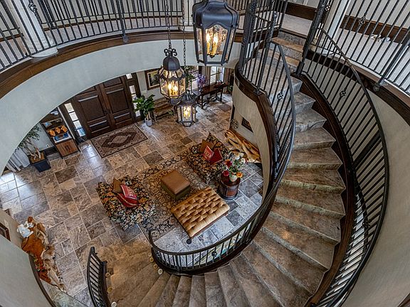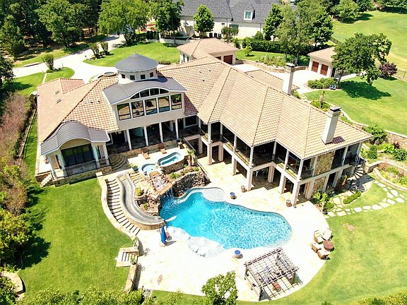 Stunning home is like living in your own resort! Lush grounds & custom pool w/water feature, hot tub, waterfall, slide & lots of outdoor living areas for entertaining! Spectacular home has breathtaking VIEWS of the pool, golf course & pond & doors that open to allow indoor/outdoor living! Curved staircase & rotund in grand foyer w/distressed cobblestone floors. Family Rm, Kit. & Dining offer the character of antique reclaimed wood floors. Family Rm has FP, built-ins opens to Kit. & dining nook. Kit. is cook's delight with Wolf gas range, leathered granite counters, HUGE Butler's pantry, wine bar & more! Mstr Suite has drop down TV, his/her walk-in closets, & lots of windows! Mstr BA boasts heated floors, jetted tub, shower, sauna & hot tub!