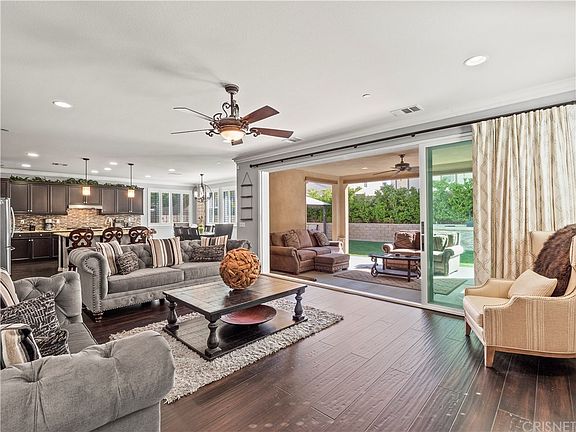 Gorgeous executive style 4 bed, 4 bath Santa Clarita home with TONS of tasteful upgrades! NO Mello-Roos and low HOA dues of $83.00/month. As you enter, the real bamboo wood flooring gleams and contrasts beautifully with the oversized crown and base moldings! The family room is expansive and features a fireplace, plantation shutters, pre-wired surround sound, and an upgraded glass panoramic door that leads you to the immaculate backyard! The kitchen has all stainless steel appliances, upgraded cabinetry, island with sink and pendant lighting, custom tile backsplash with double bullnose-beveled granite countertops. Downstairs has a generously sized bedroom with a full en-suite bathroom. Upstairs are the three additional bedrooms. The master quarters offers a walk-in closet and bathroom loaded with custom touches such as a walk-in shower, soaking tub and custom tile work, granite counters and upgraded cabinets. There is also a nice sized loft w/built-in surround sound wiring. This backyard is ideal for entertaining, with the custom-built "California Room" with recessed lighting, ceiling fan, outdoor fireplace, and pre-wired! Additionally, a kitchen space made with stacked stone accents, concrete slab counter, & plumbed sink! There is also a custom concrete pad with covered gazebo and fire pit to enjoy year-round! This home also has a Tesla (8.45KW) solar system, tankless water heater, three-car tandem garage, and approximately 7 more years left on the builder warranty!