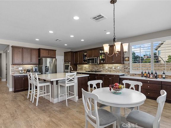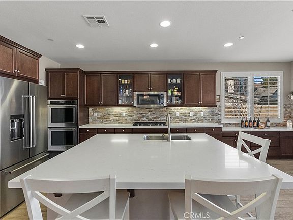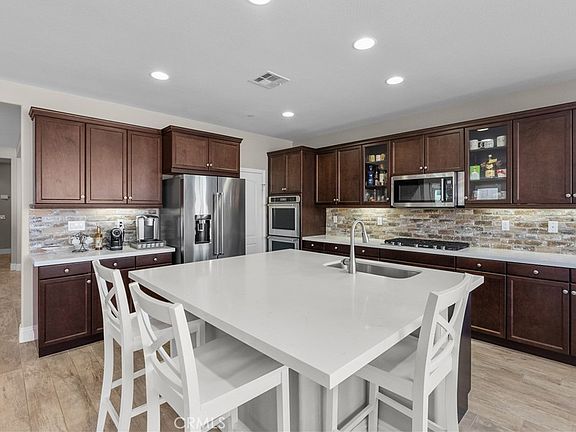 Welcome home to this immaculate showpiece, the hand selected quality upgrades shine throughout. The 4 bedroom 3.5 bath 3558sqft versatile floorplan is perfect, featuring 1 bed and bath down accompanied by another half bath, 3 spacious bedrooms and 2 baths upstairs along with an oversized loft and laundry room. Gorgeous tiled wood floors w/6 inch baseboard finish, flow throughout the entire downstairs. The kitchen is a culinary haven with SS Kitchen Aide appliances, quartz countertops w/custom brick backsplash and a seamless flow of recessed lighting, oversized center island and walk in pantry, under counter lighting, extended buffet bar and added cabinets. Cozy up in the family room or open your accordion doors to your California room boasting a fireplace w/mantel, ceiling fan and recessed lighting, complemented by a large yard w/custom pavers and lush grass area. Unwind in style as custom appointments abound with window casings, paint, bathroom mirrors, decorative ceiling fans, stair railing with pony wall, built in organizer in primary and plantation shutters. Immerse yourself in comfort with dual air conditioning, tankless water heater, rain gutters and solar! This home is the epitome of sophistication and convenience. The 3 car garage is finished and painted with access to your side yard. The driveway has been widened with custom pavers along both sides of the driveway. Pack your bags, your ideal home awaits! NO MELLO ROOS!!!!