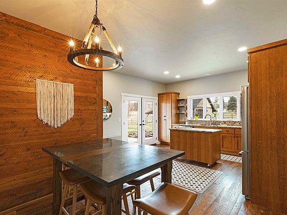 Montana dream property with acreage and spectacular views of the Bitterroot Mountains, located between Stevensville and Hamilton. Enjoy the serenity of starry nights, mountain views, and open space in convenient proximity to amenities. Built in 2011 and well maintained, this home features 3 bedrooms, 2.5 baths, and a detached double-car garage. Circular sawn wood flooring, exposed wood beams, combined with white trim and high ceilings provide a rustic vibe with a modern and fresh feel. The kitchen is brightly lit with natural light, and includes stainless steel appliances, granite countertops, and a moveable island. There is a cozy eating area with wood accent walls. The large living room has a wood burning stove and access to the beautiful fenced backyard. Conveniently located off of the living room is a half bathroom & laundry room. The main floor also features a primary bedroom with ensuite 3/4 bathroom with tiled shower. The upstairs adds a ton of additional living space! There is another full living area with a gas fireplace, vaulted ceilings, and huge windows with glass doors with access to the western facing deck, taking full advantage of the views! Additionally, there are two full bedrooms complete with vaulted ceilings, an additional balcony, and a full bathroom. Outside, this home has an abundance of land with 6.98 Acres, perfect for animals or just some space to spread out. There is a smaller fenced in yard space with a firepit area, underground sprinklers, multiple patios, and landscaping. This yard is an entertainer's dream! There is a detached double car garage with extra covered parking area. Call Cortney Perreten (406) 370-3978 or your Real Estate Professional for a showing!