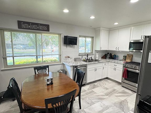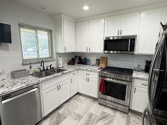 Large backyardStainless steel appliancesNewer cabinetsSink matching counter topsGas stoveBuilt-in microwaveKitchen with beautiful countertops
