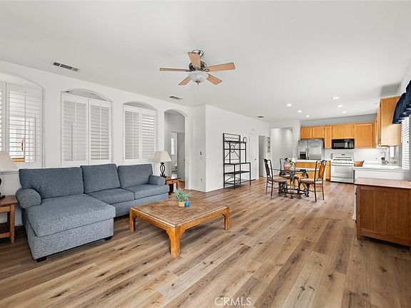 Beautifully updated Capri model home PRICED TO SELL! Located in the vibrant 55+ Gate Guarded Community of the OASIS. Live the Resort lifestyle! This popular plan has 2 large bedrooms PLUS an additional den/office that can easily serve as a 3rd bedroom. The spacious open concept floor plan showcases the newly installed vinyl plank flooring throughout the home. The immaculate kitchen boasts plenty of cabinet space, tile countertop island and natural light from the surrounding windows to enjoy gatherings and entertaining. Connected is the great room complete with cozy fireplace and built in entertainment center. Additional spacious dining room. The fabulous primary bedroom and bath has a custom tile fully remodeled handicap accessible walk in shower. Low maintenance rear yard with covered patio perfect for entertaining guests, BBQs or just enjoying a morning coffee. Two car garage with ample storage space. HOA covers front yard Water & Landscape service and trash service. Just minutes from all shopping/ medical/restaurants & easy freeway access! Right next to Menifee Lakes Golf Course and just a short drive to the Famous Temecula Valley Wine Country. You won't want to miss this adorable home! Call to schedule a private tour today!
