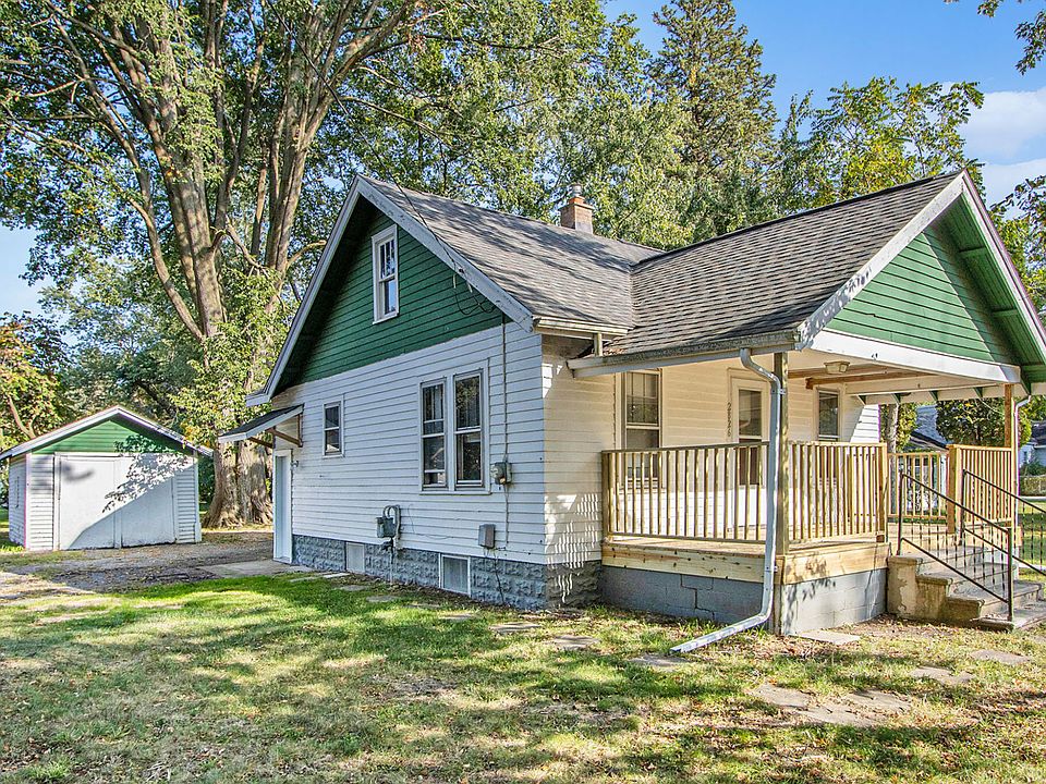Charming 2-bedroom bungalow with covered porch, basement, stove, refrigerator, laundry hookup, all window coverings, and large storage shed.