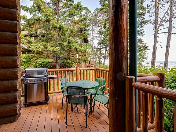 Cozy and secluded 3-bedroom, 3-bath log home with stunning views overlooking Lake Superior and surrounded by tall, mature pines. This unique property offers a full kitchen on the main level plus two additional kitchenette-equipped units, each with lock-out capability—perfect for using the entire home yourself or renting out the rooms individually. Enjoy multiple decks where you can relax and listen to the waves, two Jacuzzi tubs, and two stone-wrapped gas fireplaces. The home features all-new appliances, newer water heaters, and a roof replaced in 2021. Located within a resort community, you’ll enjoy access to the restaurant, pool, WiFi, and full resort amenities, all while feeling tucked away in your own private retreat. A rare opportunity to own a full-ownership share—these seldom become available.