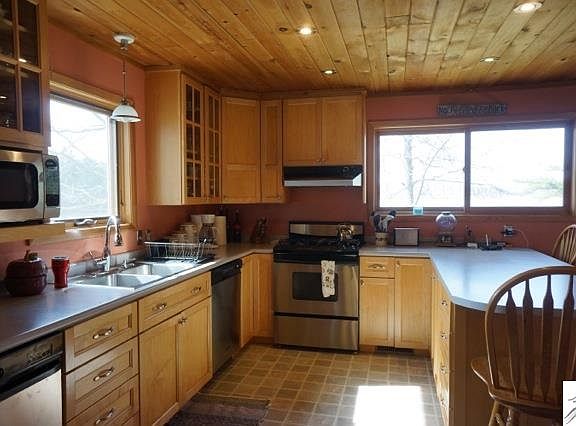 Year round spacious Rainy Lake home on a protected area of the lake. A level walk from your large front deck to the lake with a 95 foot dock will give you plenty of space for your boats or float planes. The recently remodeled lake home is finished with a variety of wood, birch, pine and cedar plus a new kitchen. On the upper level you can enjoy a cup of coffee from your balcony over looking the lake. With all the extra space on the upper level you have potential for a 3rd bedroom. You may think the home has a residential feel when you first drive to the home, but take time to tour the home and lakeside of the property. You will realize that this is a good price for a lake home on a world class fishery. Rainy Lake is 212,000 acres in size with 1,600 islands. Explore the Voyageurs National Park or travel into Ontario for a day of boating or fishing.