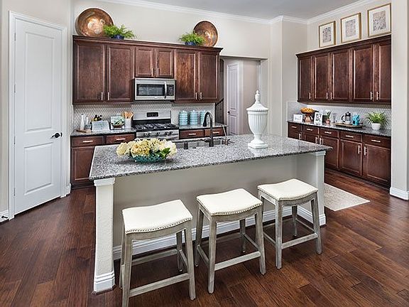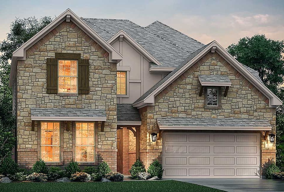 The versatile two-story Louvre floor plan by Village Builders features a unique dual living arrangement. A Home within a Home®, the private suite boasts a separate and private front entry, living room, bedroom, full bath, and a handy kitchenette. The main home features a welcoming front porch and foyer entry, an island kitchen with walk-in pantry, open dining room, walk-in utility room, a spacious family room with the option to add a corner fireplace, two car garage, and relaxing covered rear patio. The master bedroom features an en suite bathroom with dual sinks, separate shower and tub, private toilet enclosure, and a large walk-in master closet. The first floor also boasts a second full bedroom and bathroom. The second floor features two additional bedrooms, two full bathrooms, and a generous game room. The Louvre Next Gen® floor plan also offers the option to add an extended covered rear patio.