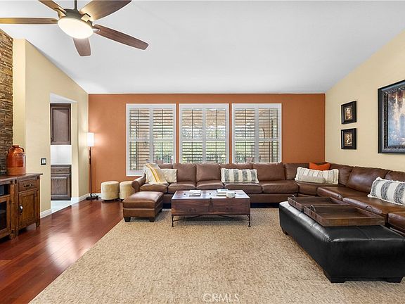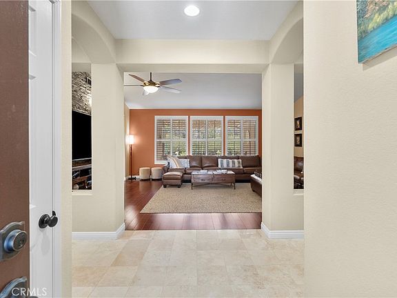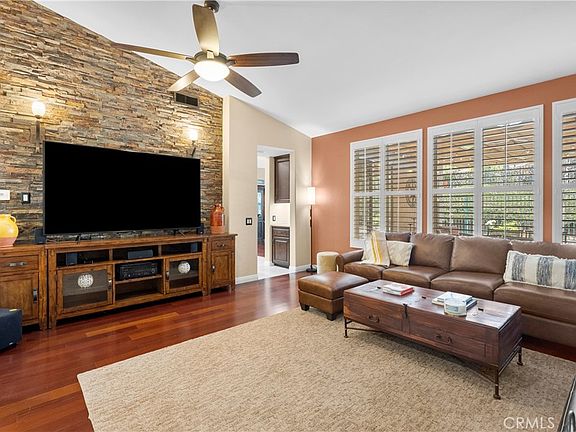 This spacious almost 2,400 sq. foot single story home with a 3 car garage home is located in the wonderful Canyon Crest neighborhood. This home features high ceilings and offers a formal entry laid with travertine tile, and beautiful wood flooring that cascades throughout most of the rooms. Step into the upgraded kitchen that boasts a center island, under cabinet LED lighting, beautiful wood cabinets with soft close hinges, travertine tile back splash, newer microwave and Decor 5 burner cooktop. Entertain in the formal dining room with a beautiful wood burning stone fireplace, large windows and patio sliders upgraded with plantation shutters. The main suite has a hallway entry, a separate upgraded tub and shower, dual sinks, a large walk-in closet and sliders that go out to an expanded patio. A second and third bedroom with walk in closets and a full bath. A fourth "potential" bedroom or den that the seller uses as an open office. The backyard is low maintenance with sprinklers and new fencing that backs to the green belt. New energy efficient AC condenser unit, and LED lighting throughout. This house is perfect for entertaining and large family gatherings!