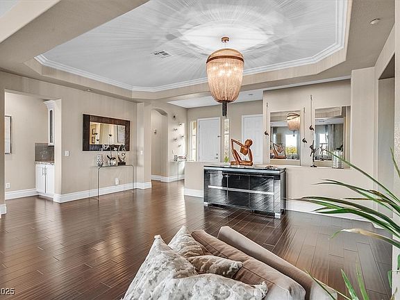 Discover a one-of-a-kind retreat in the heart of Seven Hills—an intimate, gate-guarded estate perched high above Henderson, offering mesmerizing views of the Las Vegas Strip and the dazzling Sphere. Elegantly remodeled to perfection, this single-story sanctuary combines timeless sophistication with modern technology. Sunlit interiors flow seamlessly across rich wood floors and open gathering spaces, anchored by a chef-inspired kitchen with a dramatic oversized island. The living room is thoughtfully appointed with a bespoke entertainment center, remote-controlled fireplace, and immersive surround sound for memorable evenings. Indulge in the serene primary suite your private spa escape featuring a lavish walk-in shower, freestanding soaking tub, and expertly crafted closet. Step outdoors to a lush paradise with a shimmering resort-style pool and spa, nestled against the sparkling cityscape. Seven Hills, where comfort, luxury, and iconic views come together in a truly intimate community.