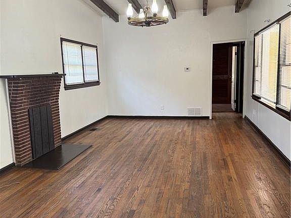 Brick fireplaceLarge fenced backyardExposed beamsHardwood floorsQuiet neighborhoodScreened-in porchPrivate driveway
