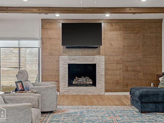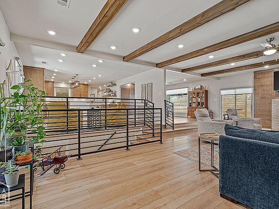 Tucked away in a cul-de-sac, this recently remodeled mid-century modern home offers wide-open living spaces with stylish upgrades throughout. From the iron gate and statement front door to the welcoming courtyard, every detail has been thoughtfully designed for both comfort and entertaining. The kitchen is a showstopper, featuring a large island with granite waterfall countertops, stainless steel appliances, a wine bar with floating shelves, and a large pantry with hidden door. The dining area provides ample space for gatherings, while the living room showcases striking beams, a fireplace with accent paneling, and an elegant iron railing leading to the basement bonus second living space. Each of the three spacious bedrooms includes its own full bath plus there's an additional half bath for guests. The primary suite boasts a walk-in closet, abundant natural light, and a spa-like bath with a walk-in shower, soaking tub, double vanity, and custom built-ins. The laundry room offers extra storage. This home blends modern design with thoughtful functionality perfect for both everyday living and entertaining.The backyard features a large fenced in area and fire-pit space.