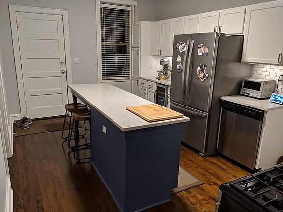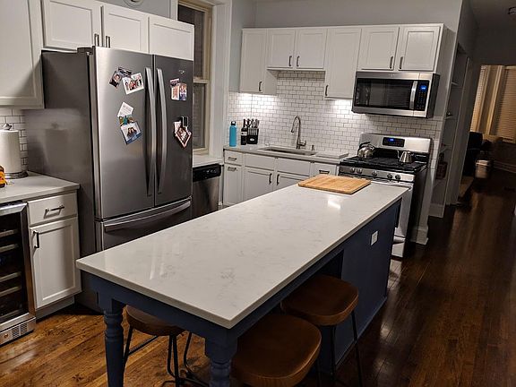 Available September 1st is a recently renovated 1.5bed/1bath apartment (second bedroom perfect as an office or guest bedroom) nestled on a tree-lined street in the heart of Logan Square, just steps from the Logan Square blue line stop (3min walk to the Spaulding Ave. entrance). Enjoy this premium location which is only two blocks from Milwaukee Ave and some of the area's best bars, restaurants, gyms, and grocery stores (Harding Tavern, Hopewell Brewery, Dill Pickle Grocery Store, Superkhana, The Walk-In, XSport, Logan Square Gym). This unit is complete with a big westward facing bay window and tons of natural sunlight, a newly renovated kitchen with massive center island and quartz counter tops, ample cabinet space, stainless steel appliances (dishwasher and wine fridge included), tile backsplash, refinished hardwood floors, additional secured storage room, in-unit washer/dryer and central heat & A/C. There is also a covered back porch great for a three season room or additional storage needs! (Floor plan and measurements included in pictures) Take advantage of this gem during the summer months with a backyard patio, complete with a gas grill and fire pit! Garage parking available for $150/mo. Owner pays for trash and water; tenants pay for gas and electric.