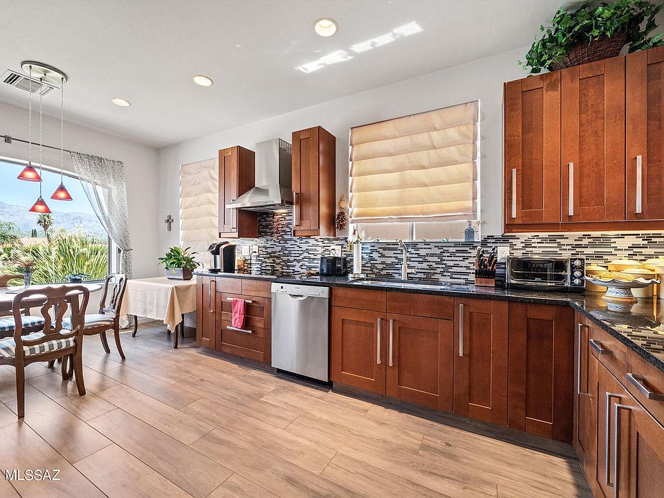 This home as it all, updates, views, and privacy! Located on one of the best elevated lots in center of neighborhood with panoramic Catalina Mountain VIEWS. Modern kitchen features birch cabinets, granite counter tops, and SS appliances. Original builder included upgraded decorator lighting, upgraded fixtures & upgraded insulation. Current owner added beautiful porcelain wood-look flooring throughout and remodeled the primary bath with tiled walk-in shower and new glass door, plus a new soaking tub. Here is your opportunity to call desirable Vactor Ranch home. Perfect location near Sabino Canyon Recreation, Udall Park & The Loop Path; plus shopping, restaurants, & more.