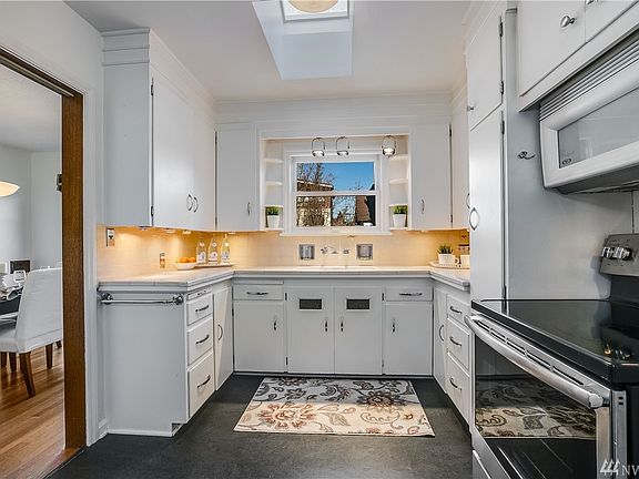 Stunning mid-century charmer in the heart of Ballard! Lovingly maintained featuring a freshly painted interior, sunny living room with gas fireplace and hardwoods on most of main floor. Updated bathroom, 2 huge bedrooms on main floor, one with sliders to lovely deck overlooking private backyard. Retro-chic family room downstairs with paneling, gas fireplace and swing out bar- party central! Solar panels make this home efficient and affordable. Walk to Sunday Market, Locks, restaurants and shops!