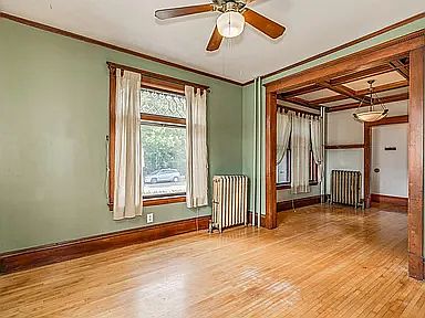 Refinished hardwood floorsHigh ceilingsUnpainted woodworkEnclosed front porchStainless steel appliancesDining roomLaminate countertops