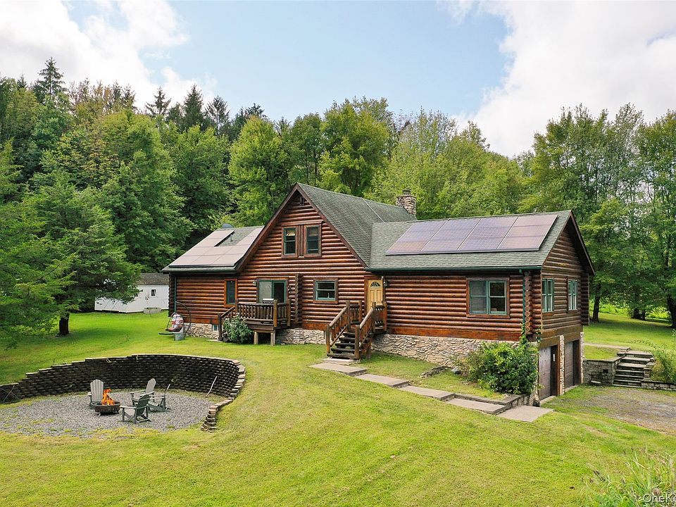 Charming log cabinModern updatesWarm wood detailsFire pitOpen floor planSoaring ceilingsExpansive grounds