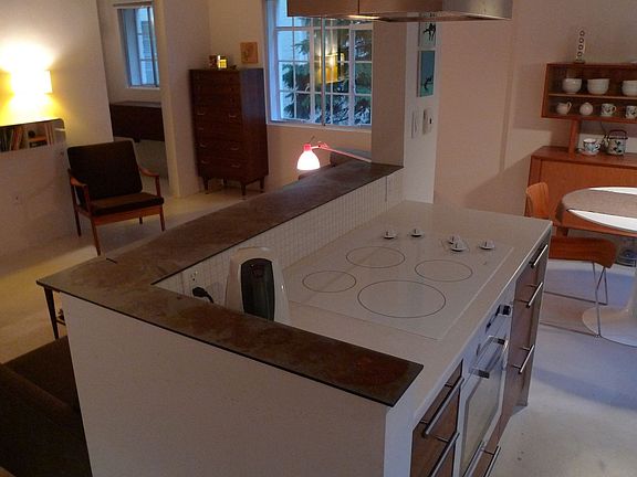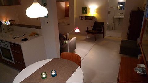 Studio apartment with sleeping pod. In 2008, complete and fully-contracted remodel for energy efficiency and low VOC's: - All new plumbing and mostly new wiring. - Recycled gypsum drywall (Toughrock) in living area. mold-resistant drywall (Densarmor) in bathroom. - Ultratouch recycled cotton insulation everywhere, R-value of 30. - Forestry Stewardship Council wall studs. - Separate in-floor heating systems for concrete floor in main area (Warmly Yours) and tile in bathroom (Suntouch), which easily heat the apartment on the coldest days. - Runtal towel warmer in bathroom. - High-end fixtures. Rotaliana lighting, Lacava sink and faucet, Grohe showers, Caroma dual flush, wall-hung toilet. - Silestone countertops. - Vestfrost low-energy fridge. - Excellent ventilation (including Falmec range hood). Natural wood blinds added in 2014. Ample storage space in basement. The Belvedere has 30 units on three floors, built in 1927. Pets allowed.