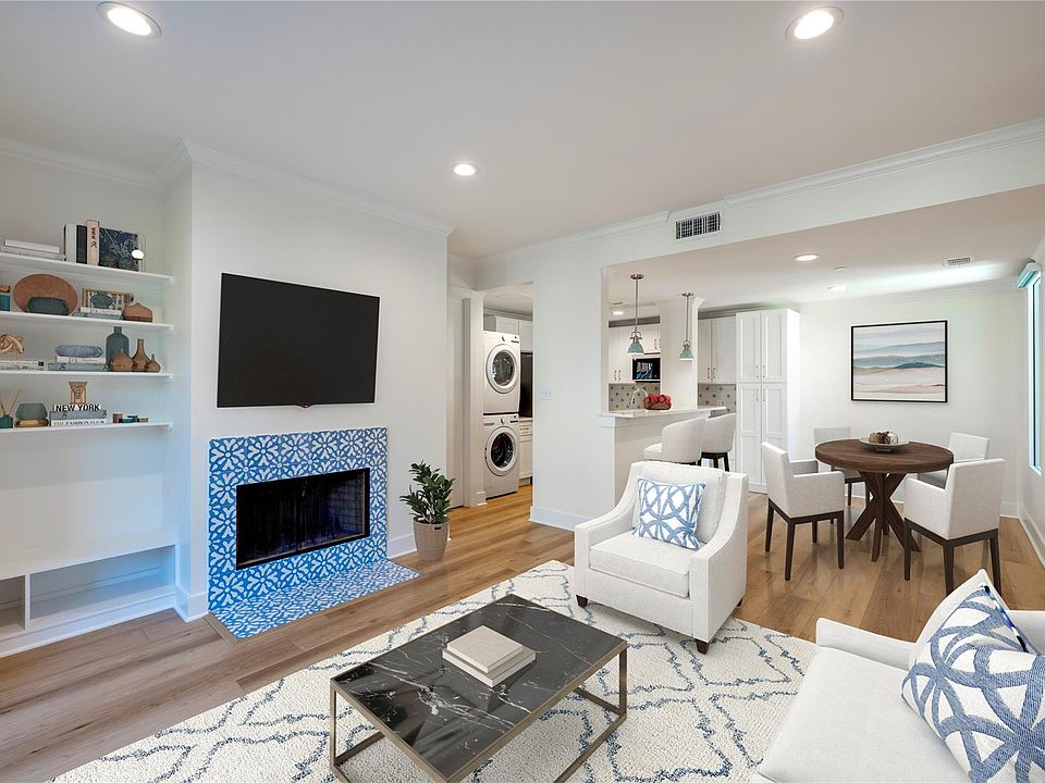 Stunning, never-lived-in corner unit in brand-new building at Park St. John! #199 is a quiet ground-floor 2 bed/2 bath condo that neighbors a peaceful fountain & features designer touches throughout. Enjoy a brand new AC system, new stacked W/D, premium vinyl plank flooring, living room w/fireplace & built-ins, upgraded lighting w/dimmers throughout, & custom electric blinds (blackout in bedrooms). Open floor plan connects kitchen, dining, & living spaces. Well-appointed kitchen w/convenient pass-through to dining room, Bespoke appliances, ample cabinetry & custom-made drawers. Bathrooms feature modern fixtures & tile work. Primary suite w/spa-like bath & walk-in closet. 2nd bedroom could also be a gym or home office. Entertain or relax on large private & covered patio w/Spanish tiles. Community includes 2 pools, lush landscaping & assigned covered parking. Prime inner loop location near Central Market, Tiny Boxwoods, Tres Market, Highland Village, & Pumpkin Park. All per seller.