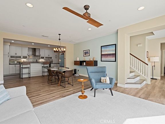 The home features a bedroom and full bath downstairs, plus a spacious loft upstairs, perfect for a second living area, home office, or playroom. Inside, you’ll find luxury vinyl plank flooring throughout, plantation shutters, and abundant natural light. The remodeled kitchen boasts white cabinetry, quartz countertops, stainless steel appliances, a six-burner stove, and recessed lighting—all opening to the living and dining areas for seamless entertaining. A sliding glass wall expands your living space into the tranquil, low-maintenance backyard.