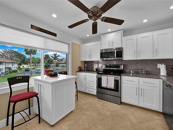 Beautifully renovated condo with spectacular view waiting for you! This condo is decorated in midcentury modern style, featuring functionality, clean lines and simplicity. Kitchen has been redesigned with white cabinets and smooth surfaces with open sight lines to dining room and living room. Custom designed movable kitchen island that adds extra storage. All appliances are 4 years old AC is 3 years old and hot water heater is 4 years old.Custom designed divider between the dining room and living room that adds storage and can be moved reconfigure living space. Popcorn ceilings have been removed in living areas. Guest bathroom has new tile and new vanity. Master bath has an extra large new shower with beautiful tile. The Glades Golf & Country Club offers unlimited play on two Gordon Lewis Golf Courses that were renovated in 2018 with new irrigation, paspalum grass, and sustainable landscaping throughout. Other amenities include, tennis, pickleball, bocce, shuffleboard, Pro shop, 19th Hole restaurant, and clubhouse with many activities during season. All of this is just 10 minutes from downtown Naples 5th Ave resturants, shops and beaches.
