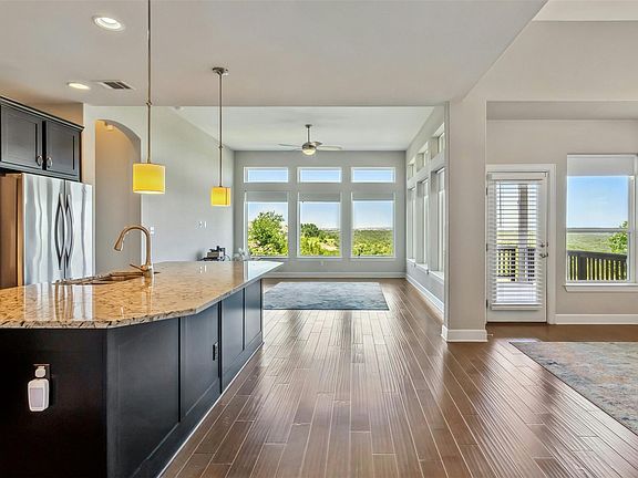 Modern appliancesHill country viewsQuiet light-filled officeOversized windowsSleek countertopsLarge eat-in island barWide deck