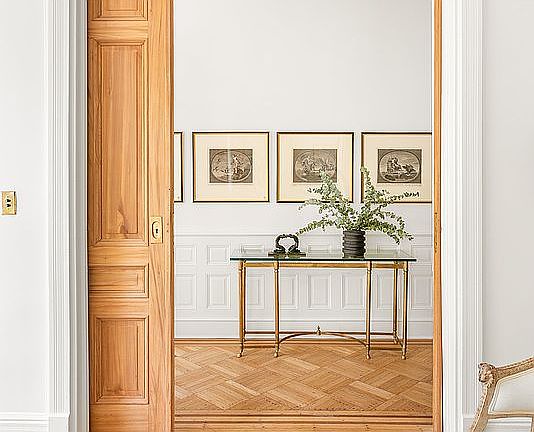 The dream kitchen is bespoke perfection with custom cabinetry, honed marble countertops, integrated Bertazzoni and Miele appliances, and Croft of London brass hardware. A restored original built-in cabinet graces an entire wall and makes this already impressive space an undeniable showstopper. Floor-ceiling custom mahogany doors lead out to the rear terrace and into the landscaped garden.