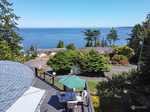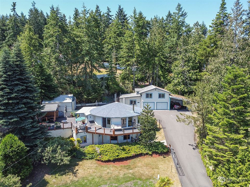 Amazing water view home with incredibly unique features throughout. Main home is a distinctive, round two story home with vaulted ceilings & big views from almost every room. Giant outdoor living space with an outdoor covered kitchen & covered wet bar perfect for entertaining. Wrap around deck, RV hookups & boat parking, 2 huge shops/garages, and massive amounts of storage space. Newer 2 bedroom ADU adjacent to and above the detached garage, with full kitchen and even bigger water views. This is a very special property with some unusual qualities. A must see for those looking for a home/retreat that embraces big water views and maximizes the usability of outdoor living areas, with a cool mix of retro and modern.