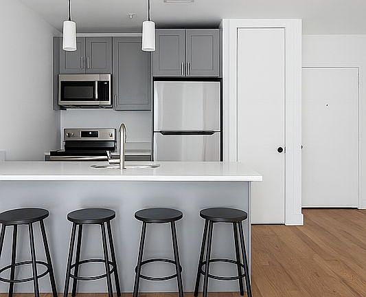 • Contemporary open-concept kitchen featuring quartz countertops, premium cabinetry, and a full suite of stainless steel appliances