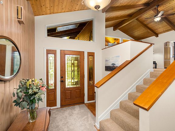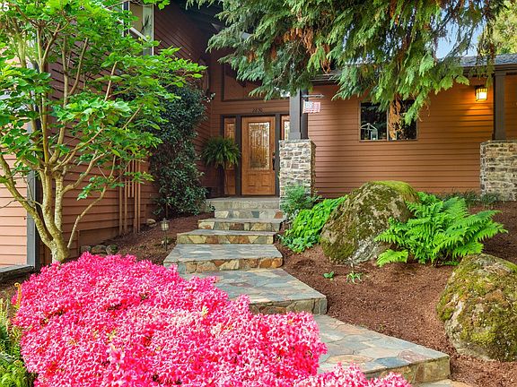You’ll love living and entertaining in this distinctive property in the well-established Savannah Oaks/Barrington Heights neighborhood of West Linn on quiet private .91 acre almost level parcel that is subdividable! This custom home showcases vaulted wood ceilings, cabin-inspired charm, and reverse-living floorplan. Enjoy the incredible, secluded gardens with mature landscaping and huge lawn. Beautiful southern views! It’s your peaceful sanctuary. Main level features great room with woodstove and dining alcove, updated kitchen and eating bar, gorgeous sunroom overlooking the vast garden, and separate family room that opens onto large lanai adjacent to beautiful water feature and waterfall. Bedroom level includes updated primary suite with new bathroom, large walk-in closet, access to private patio, and garden views. Large two-car garage and separate building with another garage and shop or studio space, plus storage loft. Close to Willamette River and West Linn’s Historic Willamette District. Conveniently located-just a 2 minute drive to shopping & restaurants, plus easy drive to Marylhurst and downtown Lake Oswego. Great for walkers and hikers, close to parks, and minutes from greenways and trails!
