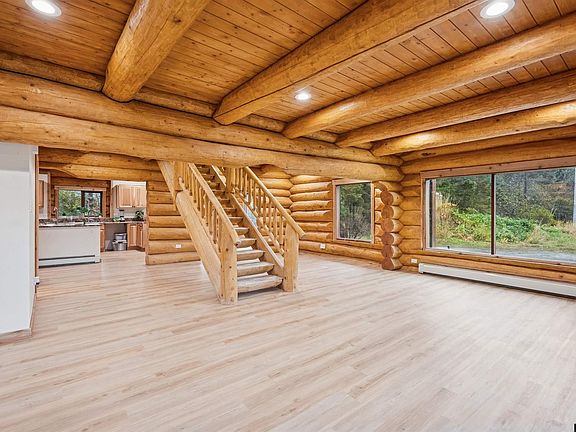 This beautiful log cabin home offers the perfect blend of rustic charm, modern comfort, and opportunity. The 3BD/2.5BA home also includes a 1BD unfinished apartment - ideal for creating income, a guest suite, or extended living space. The home sits on a spacious .78 acre sunny lot that has plenty of space for parking, gardening, and outdoor enjoyment. The open concept floor plan showcases natural wood finishes, vaulted ceilings, and plenty of light, creating a comfortable, welcoming feel throughout. Upstairs, enjoy a private balcony off the primary bedroom, two other bedrooms, and a versatile bonus room that can be used as a home office, hobby space, or extra guest area. This home is a rare find for someone looking for Alaskan living with opportunity for rental income.