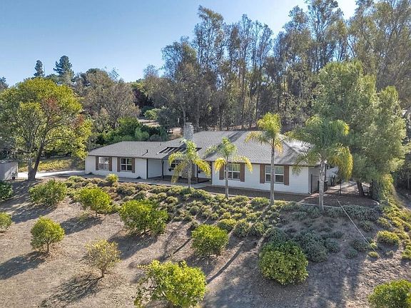 This single-level custom home is located in Fallbrook. This property offers a unique blend of comfort, space, and privacy. The home features 3 bedrooms and 2.5 baths, situated on a spacious 42,000+ sq ft lot. Key highlights include a large country-style kitchen equipped with stainless steel appliances and a new gas range/oven, ensuring a modern and functional cooking space. The property also boasts a new roof, providing peace of mind for years to come. Inside, you'll find a welcoming family room and a formal entry leading to the living room. The bedrooms are spacious, with a particularly large primary bedroom offering a comfortable retreat. The home has been updated with upgraded doors and windows, enhancing both aesthetics and energy efficiency. Flooring throughout includes elegant hickory plank, durable tile, and cozy carpet in the bedrooms. Additional interior features include granite countertops, two wood-burning fireplaces in the family and living rooms, plenty of storage space. Practical amenities such as an extra-long garage accommodating 3 cars, central AC, and ceiling fans are also included. The exterior of the property is equally impressive with fully irrigated landscaping, featuring a charming small orchard. This orchard includes a variety of mature fruit trees such as orange, grapefruit, plum, lemon, lime, pomegranate, and pear, offering fresh produce right at your doorstep. You'll love entertaining on the ample outdoor patio. The home's central location in Fallbrook provides easy access to downtown shopping and is conveniently close to the 15 & 76 freeways, balancing a peaceful living environment with accessibility.