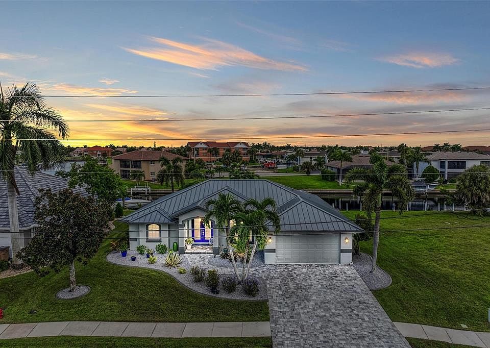 Enjoy the Southwest Florida lifestyle to the fullest in Punta Gorda Isles at this beautifully updated 3 bedroom, 2 bathroom, 2 car garage WATERFRONT POOL HOME, less than 10 minutes to Charlotte Harbor by boat and near downtown Punta Gorda shops & restaurants, too! From the exterior enjoy fantastic updates including a brand-new standing seam custom coated metal roof, new paint, a new front door and light fixtures, and beautiful landscaping. Inside, find a highly desired split bedroom floor plan with the primary suite on the left side, vaulted ceilings in the main living room open and connected to the kitchen, formal dining room, and dinette, a fabulous view of the water and pool through 8' sliding glass pocketing doors, and two more ample guest bedrooms with a shared bathroom with direct access to the pool. Outside on the lanai, enjoy a great kitchen area and covered space in addition to a new pool cage with no-seeum screen and panoramic picture window openings, an added paver patio outside in the backyard, and a beautiful walkway to your own private dock and 10,000lb lift! Additional upgrades include NEW AC, NEW ELECTRICAL INTERLOCK for Generator Connection, NEW GRANITE COUNTERS, NEW STAINLESS-STEEL APPLIANCES, NEW INTERIOR PAINT & CARPET, NEW PAVER DRIVEWAY AND LANDSCAPE CURBING, & SO MUCH MORE. BE SURE TO ASK FOR THE FEATURES SHEET. Home has full hurricane protection & transferrable NFIP flood insurance available with the current policy only $1592! BE SURE TO CLICK THE FULL VIRTUAL TOUR LINKS FOR DETAILS!