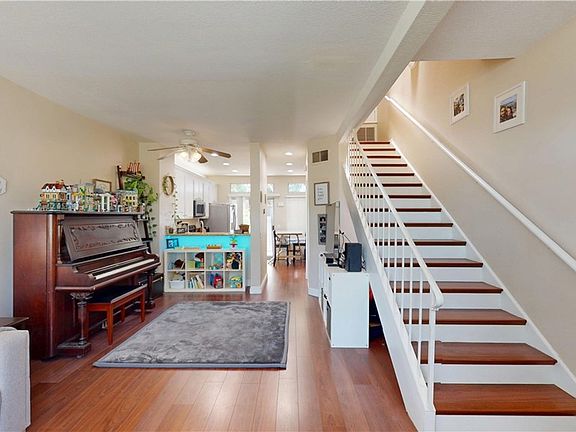 What a great Bridgeport Terrace townhome and Community! This 2 Bedroom, two story townhome, with no one above or below you, features SOLAR panels, an OPEN FLOOR PLAN, laminate flooring, enclosed stairs with the laminate flooring, large kitchen with pull-out shelves, granite counters, stainless steel appliances, double sink & faucet, recessed lighting in the kitchen, window for lots of light & a screen door. You will love the open, LIGHT & BRIGHT LIVING ROOM with views of the grassy community area, a ceiling fan in the dining area, a breakfast bar, a side counter & a walk-in pantry. The upstairs laundry includes the washer and dryer. There is carpet in the hallway as well as both bedrooms & tile flooring in the bathrooms. The Master Bedroom has mirrored closet doors and a ceiling fan. There are double sinks in the Master Bath & a tub/shower combo and a single sink in the second Bath. The second bedroom overlooks the central common areas. No neighbors behind this home. Views of trees. Double pane windows add to the serenity of this cozy home. The sliding door in the kitchen takes you to your fenced-in private patio area. The home features SOLAR, and a single detached GARAGE with built in cabinets & garage door opener as well as one reserved guest parking space. Bridgeport Terrace is a small GATED COMMUNITY in a park-like setting of 48 townhouses approximately 8 miles from Dana Point. Community was recently painted and new roofs installed in 2024. The amenities include a gated pool/spa & picnic area w/restrooms, Basic cable TV & Trash service. Complex is dog friendly. Close to the excellent elementary, middle and high Schools! Easy access to the 73 Toll Road and the 5 Freeway, Saddleback Community College, Mission Viejo Mall and the BEST BEACHES in Orange County. Love your life here!