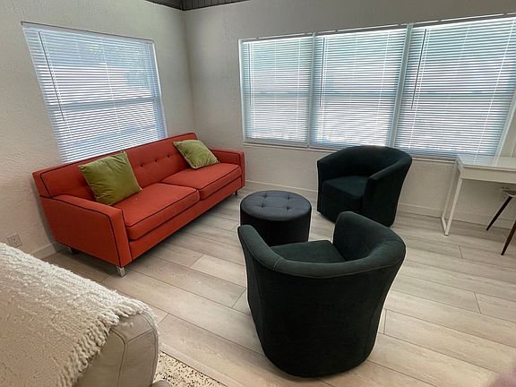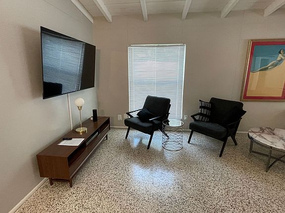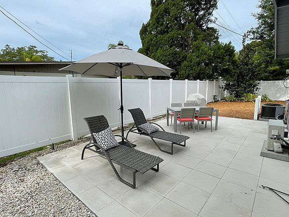 Turnkey Furnished Short Term Rental Available 1/1/26 - 1/31/26 Only. Recently renovated Mid-Century Modern 3 bedrooms, 2 baths, 1 car garage home just minutes from Downtown Sarasota. Open concept living and dining rooms with cathedral ceilings and wood beams. The Interior and Exterior of the home have been freshly painted. The home has restored Terrazzo flooring throughout. The fully equipped kitchen has new appliances, a pantry, plenty of cabinets for storage, an eat-in countertop that looks out to the living room. The master bedroom has an updated en-suite bathroom with a walk-in shower, the other 2 bedrooms share an updated bathroom with a shower and bathtub. The backyard is fenced and features an amazing paver entertainment area. Walking distance to the YMCA and famous Yoder's Amish Village. Minutes away from world-famous Siesta Key Beach, Lido Beach, St Armand's Circle, museums, and so much more.