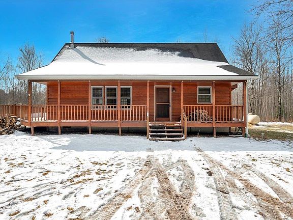 Quiet and Private Country Living home in Foxboro! Situated on over 5 acres of land, this attractive 3 bedroom/2 bath home has most everything you could want in a country home. Stepping up on to the gorgeous wrap around deck, you'll enter in the front door, and be in the large living room with it's "centerpiece" stone wood fireplace that goes floor to ceiling, and the ceilings are tongue and groove and high vaulted! Adjacent to the living room is the open and connected kitchen with it's center island, and a sliding door to the wrap around deck. Off of the kitchen is the full updated bath, and 2 of the 3 bedrooms. There is also a door to the full basement with utilities, and laundry. Upstairs in the home is a 3/4 bath with a walk-in shower and a private bedroom with door to the walk-out loft. Outside, there is a large 2 stall garage, a large shed, and a big front and back yard. Septic and water are free with this home, as it comes with a mound system and drilled well. Heat is propane forced air, or the wood fireplace to save further on utilities. And......... as an added bonus, this home is right across the street from several thousands of acres of county land! Life just seems simpler and more rewarding in Foxboro.