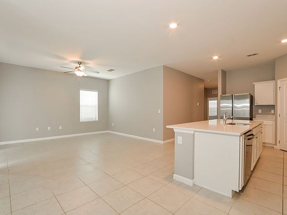 Inside, enjoy low-maintenance tile flooring, a bright living room with ceiling fan, and a modern kitchen featuring stainless steel appliances, white cabinetry, and a large center island with double sink. The spacious primary suite includes an attached bath with oversized vanity and ample storage, while three additional bedrooms and a full secondary bath provide comfort and flexibility.