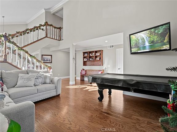 Situated on a quiet cul-de-sac, this exquisite home welcomes you with a charming brick walkway and a beautifully landscaped front yard. Step inside to the grand living room, filled with natural light and enhanced by soaring ceilings that create an open and elegant atmosphere. The downstairs features rich hardwood floors throughout, leading to the remodeled kitchen, seamlessly open to the inviting family room. This space is perfect for entertaining, with a bar area, a cozy center fireplace, and built-in surround sound with installed speakers for a dynamic audio experience. Upgrades include brand-new windows (2024), a new roof (2020), and fresh paint and plush carpet, providing a modern and move-in-ready aesthetic. The backyard is a true retreat, featuring lush fruit trees, new turf (2024), and a newly resurfaced and updated pool/spa (2022) including new pool equipment. The covered patio, complete with a custom-built bar and BBQ area, is ideal for outdoor gatherings and relaxation. With a spacious downstairs bedroom, a three-car garage, and thoughtful updates throughout, his home perfectly balances traditional elegance with modern functionality. Don’t miss the chance to experience this extraordinary property—schedule your private tour today!